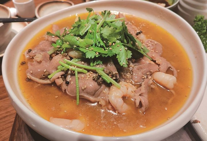 椒麻牛舌虾仁:主料牛舌虾仁,配料豆腐皮、黄瓜、豆芽、香菜、芝麻。起锅烧油,放一点秘制的椒麻酱炒,倒入开水按照顺序放入豆腐皮、黄瓜、豆芽烧熟捞出放盘,在锅中放入牛舌和虾仁烧熟捞出来放在盘上面。另起锅油烧旺的时候,放入这个大红袍花椒,淋上去再放入香菜跟芝麻即可,牛舌肉质鲜嫩,略微弹牙。
