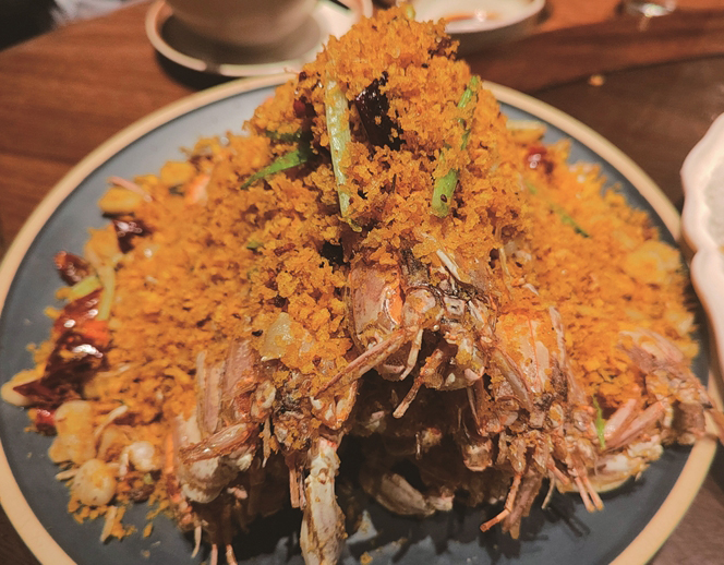 避风塘濑尿虾:用个大肉肥濑尿虾,首先要热油,下油锅前拍一点点的粉,这个油温在六到七成以后,放油里过一下,一定要达到这种外脆里嫩的效果,再放一点点底油,放入姜片、辣椒段、葱白煸炒香味以后,把濑尿虾倒下去,放一点点调味品,最后放入避风塘,小火炒,出锅后,外脆里嫩。