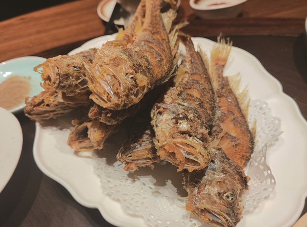 秘制醉花螺:花螺个大,一斤28个左右,经秘制酱汁腌制,食用时用牙签挑出螺肉,糯香微辣咸甜可口,记者好奇为什么每位客人挑出的肉段都是花螺肉的中间段,一位常来的朋友赶紧替主理人接话,“王剑把花螺这用冷水慢慢烧开,煮熟以后,每一颗都要挑出来,把里面的内脏全部去干净以后再放回去,一道简单的冷盘都能够考虑得如此细致,主理人在其他菜品上下的功夫、动的脑筋可见一斑。”某单位的老客林哥说。