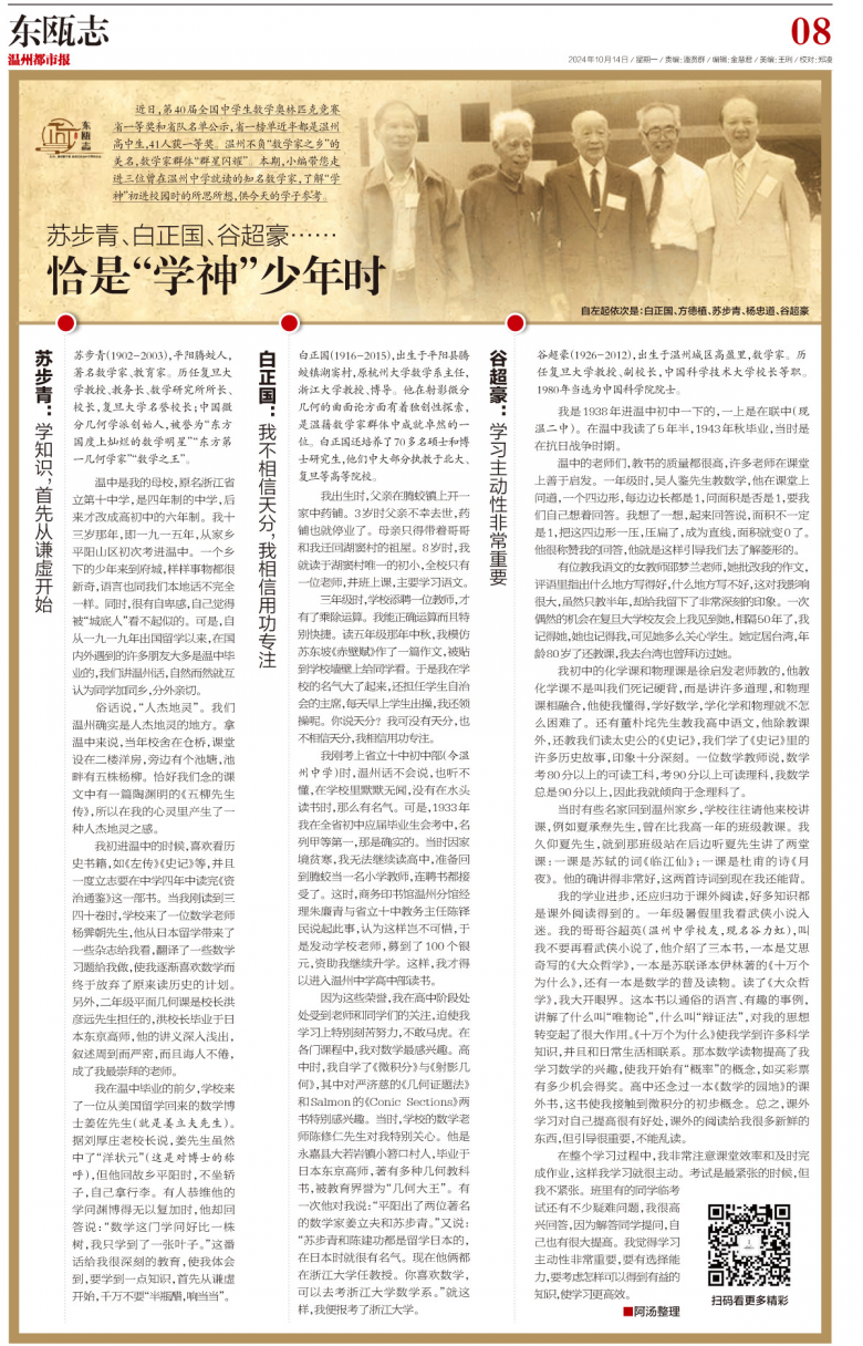近日,第40届全国中学生数学奥林匹克竞赛省一等奖和省队名单公示,省一榜单近半都是温州高中生,41人获一等奖。温州不负“数学家之乡”的美名,数学家群体“群星闪耀”。本期,小编带您走进三位曾在温州中学就读的知名数学家,了解“学神”初进校园时的所思所想,供今天的学子参考。