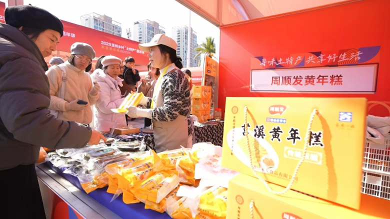 1月12日,2025温州乡村“土特产”嘉年华在温州科技广场举行。本次嘉年华汇集了温州各县(市、区)的“土特产”,其中苍南25家企业的产品凭借自身品质和特色,备受青睐,销量火爆。
