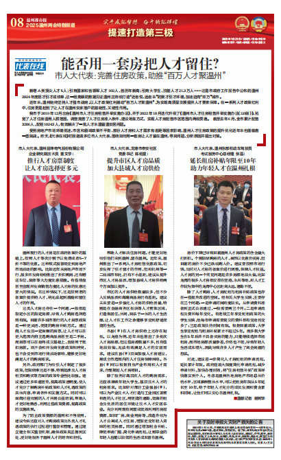 受到房地产市场环境低迷、市区和县域政策不平衡、部分人才房和人才需求有差距等因素影响,温州人才住房政策的提升优化近年来也面临着一些挑战。昨天,《代表在线》栏目邀请多位市人大代表,围绕如何用一套房让人才留在温州,寻找问题、分析原因并提出对策。
