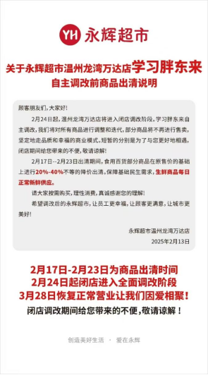 2月14日,永辉超市正式宣布温州首家“学习胖东来”自主调改店落户温州龙湾万达广场。作为浙江第三家调改门店,此次升级将从商品、价格、环境、服务四大维度全面对标行业标杆胖东来,旨在打造更贴近民生需求、更具竞争力的品质零售体验。据悉,温州龙湾万达店将于2月24日正式进入闭店调改阶段,并计划于3月28日恢复营业。