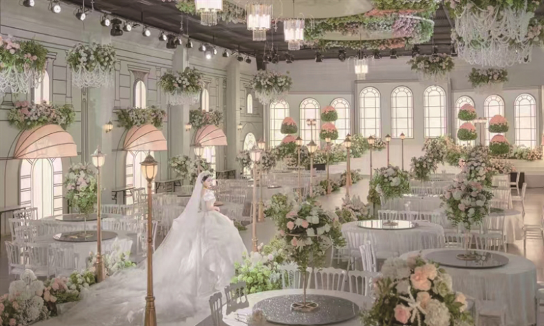 所谓“婚礼堂”,就是由婚庆公司或酒店方专门打造的婚庆厅,物料可以重复使用,让新人可以花较少的费用却能获得豪华的婚礼布置。