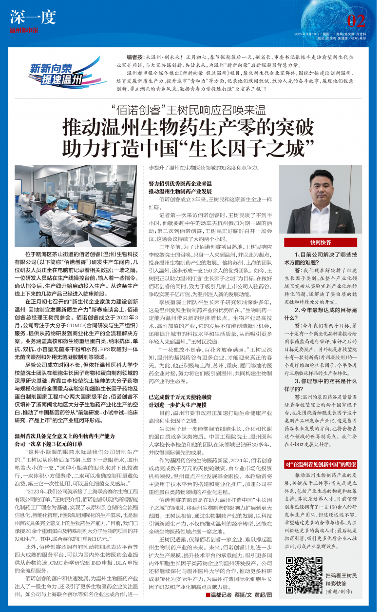 在正月初七召开的“新生代企业家助力建设创新温州 因地制宜发展新质生产力”新春座谈会上,佰诺创睿总经理王树民参会。佰诺创睿成立于2022年3月,公司专注于大分子CDMO(合同研发与生产组织)服务,提供从药物研发到商业化生产的全流程解决方案。业务涵盖真核和微生物重组蛋白类、纳米抗体、单抗、双抗、小容量无菌冻干粉和水剂、BFS吹罐封一体无菌滴眼剂和外用无菌凝胶制剂等领域。