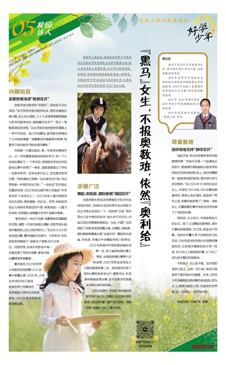 她拒绝上奥数班,却接连在世界少年奥林匹克竞赛数学和思维能力比赛中崭露头角;她从不在手机上浪费时间,小小年纪自我规划,在舞蹈、啦啦操和国际象棋等赛道一路繁花。本期《好学少年》走进温州道尔顿小学,记录该校五年级学生葛沛尧的“自主”成长之路。