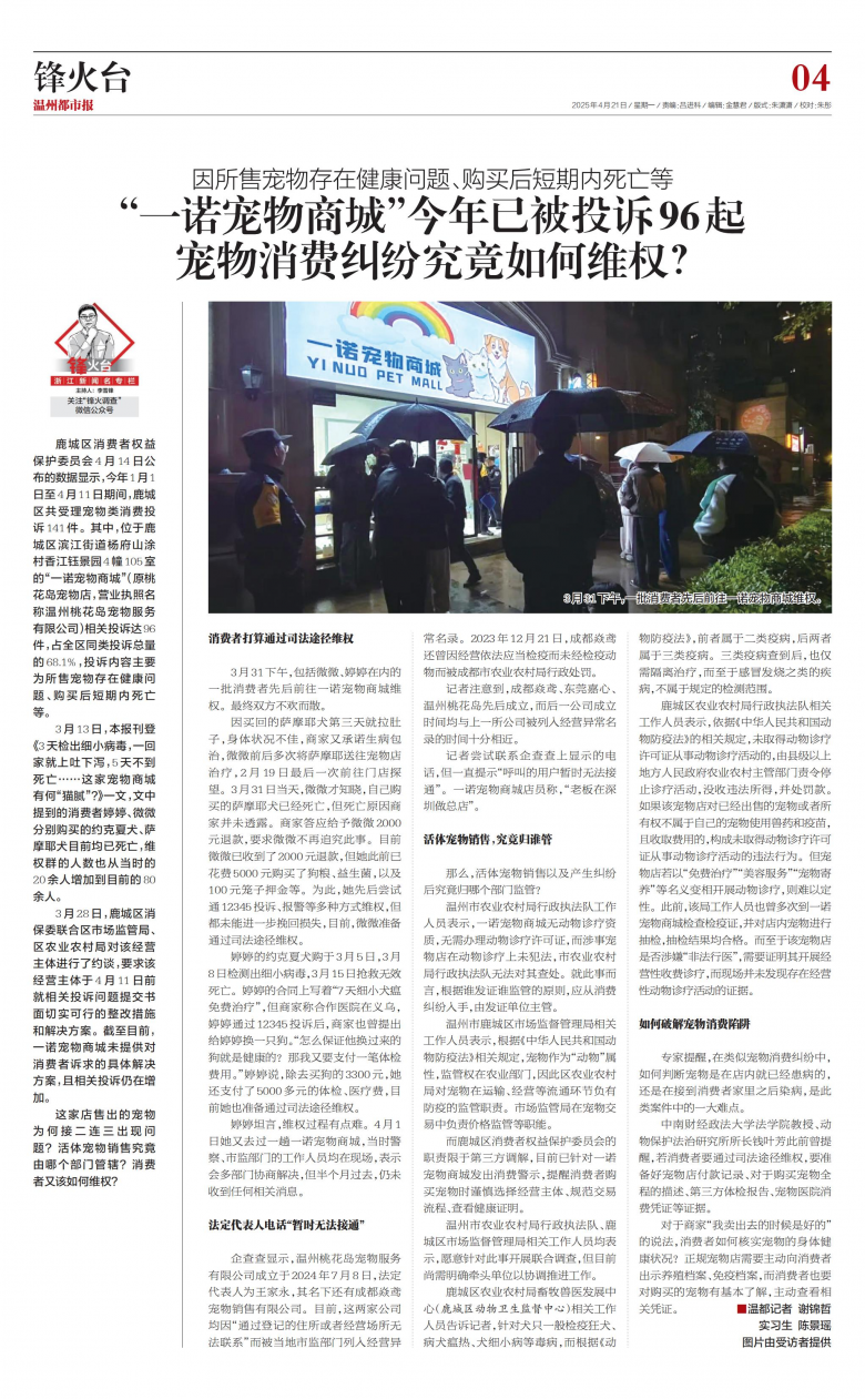 3月28日,鹿城区消保委联合区市场监管局、区农业农村局对该经营主体进行了约谈,要求该经营主体于4月11日前就相关投诉问题提交书面切实可行的整改措施和解决方案。截至目前,一诺宠物商城未提供对消费者诉求的具体解决方案,且相关投诉仍在增加。
