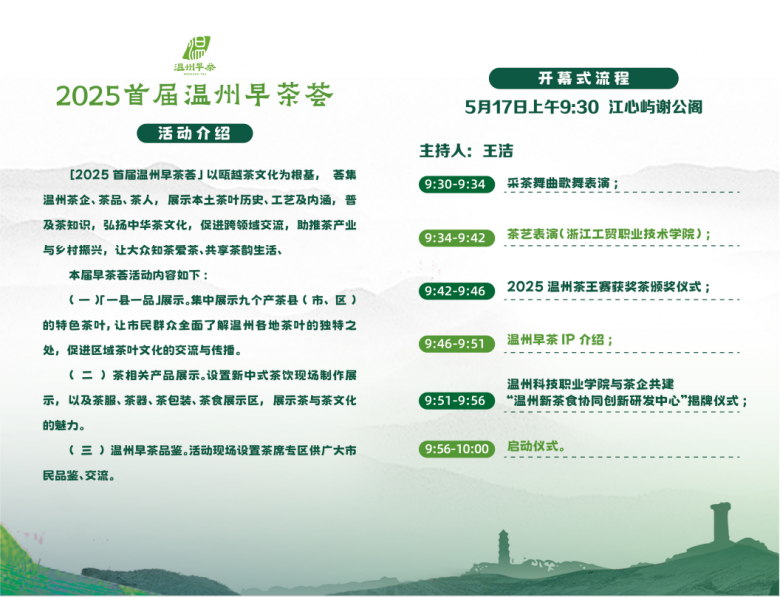 茶,是中华文化的瑰宝,承载着千年的历史与韵味。为深入贯彻落实习近平总书记关于统筹发展茶产业、茶科技、茶文化的重要指示精神,做强温州茶叶全产业链,推动乡村振兴,5月17日-18日,2025 首届温州早茶荟将在江心屿(西园)谢公阁隆重举行!