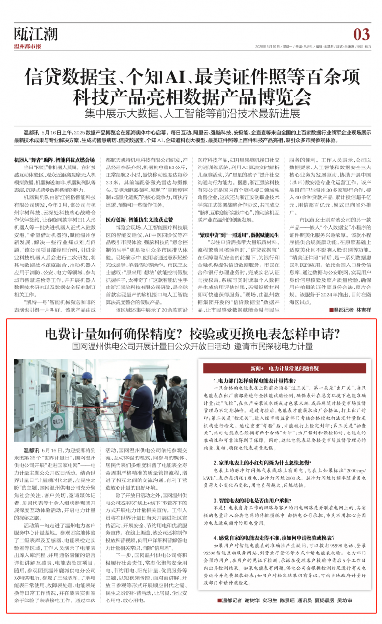 除了开放日活动之外,国网温州供电公司还采取“线上+线下”双管齐下的方式开展电力计量相关宣传。工作人员将在世界计量日当天开展进社区宣传活动,开展安全、节约用电和优质服务宣传。在线上渠道,该公司还将制作投放科普视频,向用户详细科普解答电力计量相关常识,消除“信息差”。