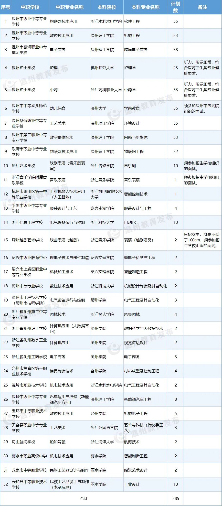 日前,浙江省教育厅办公室印发《关于下达2025年中职与本科一体化人才培养招生计划的通知》(浙教办函〔2025〕75号),明确2025年浙江省将继续推进中职与本科一体化人才培养(以下简称“中本一体化”),其中面向温州招生专业32个,共计招生计划385人。