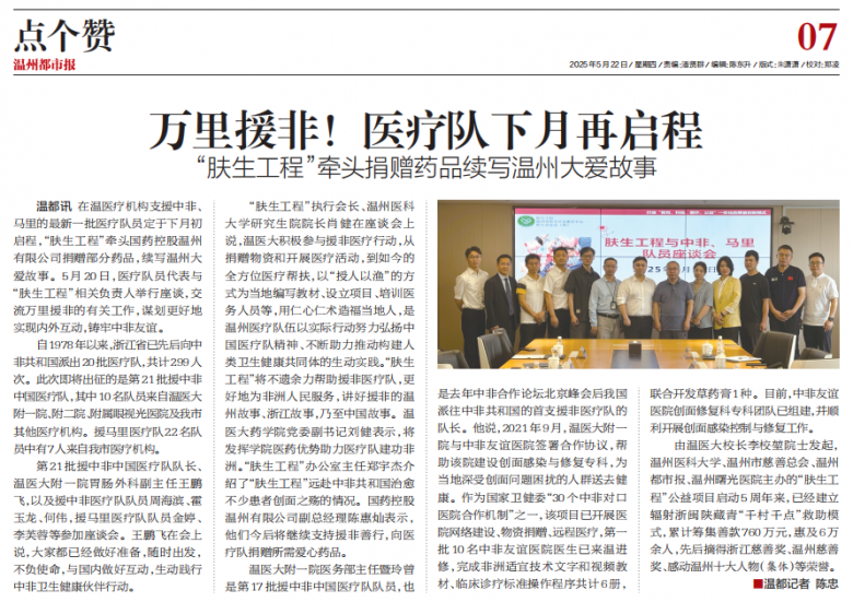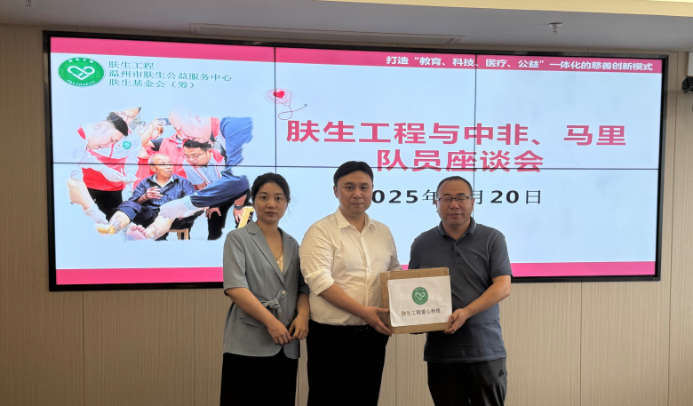 “肤生工程”执行会长、温州医科大学研究生院院长肖健在座谈会上说,温医大积极参与援非医疗行动,从捐赠物资和开展医疗活动,到如今的全方位医疗帮扶,以“授人以渔”的方式为当地编写教材、设立项目、培训医务人员等,用仁心仁术造福当地人,是温州医疗队伍以实际行动努力弘扬中国医疗队精神、不断助力推动构建人类卫生健康共同体的生动实践。“肤生工程”将不遗余力帮助援非医疗队,更好地为非洲人民服务,讲好援非的温州故事、浙江故事,乃至中国故事。温医大药学院党委副书记刘健表示,将发挥学院医药优势助力医疗队建功非洲。“肤生工程”办公室主任郑宇杰介绍了“肤生工程”远赴中非共和国治愈不少患者创面之殇的情况。国药控股温州有限公司副总经理陈惠灿表示,他们今后将继续支持援非善行,向医疗队捐赠所需爱心药品。