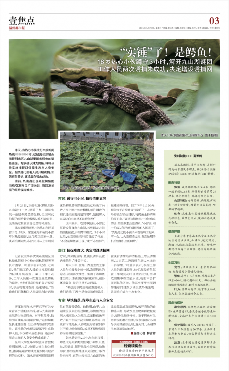 昨天,有热心市民拨打本报新闻热线88868886称,已经用长焦镜头捕捉到市区九山湖里那条鳄鱼的清晰画面。专家确认其为鳄鱼,呼吁尽快实施捕捉以保障生态与人身安全。相关部门部署人员开展诱捕,却因鳄鱼警觉、环境复杂暂未成功。