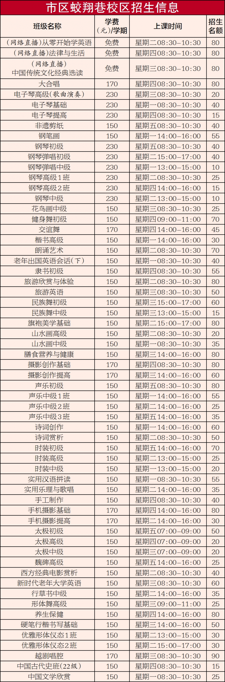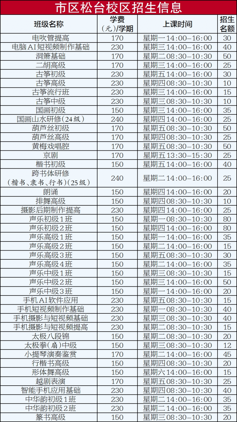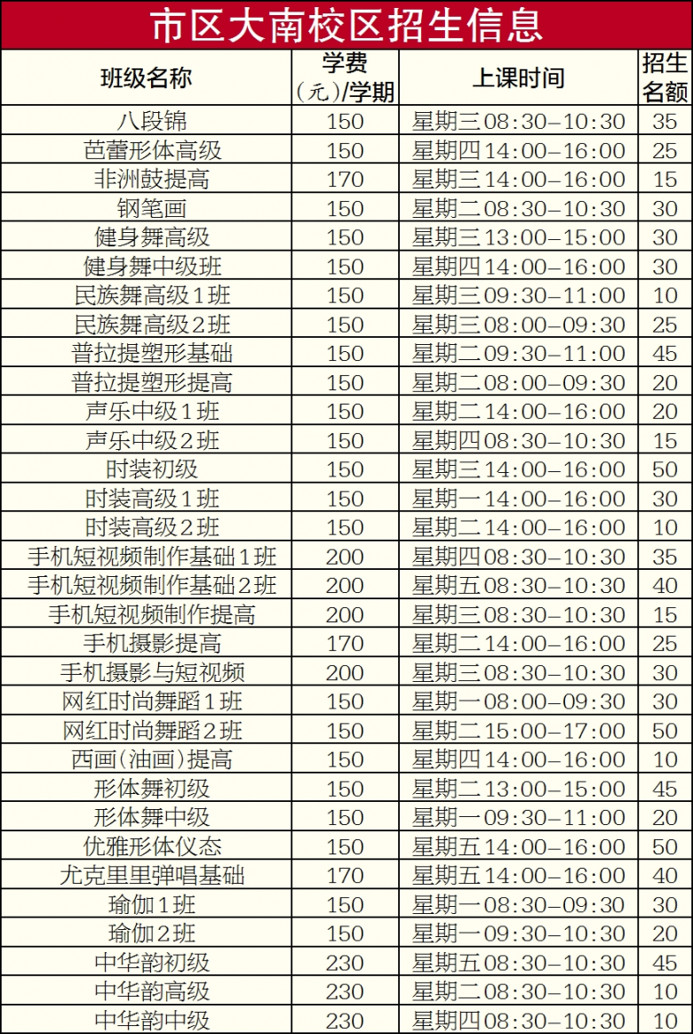 2.舞蹈、时装、摄影类、体育类课程,年龄限75周岁以下;时装课程一般要求女性身高1米60以上,男性身高1米70以上。