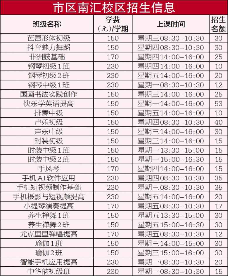 温馨提醒:舞蹈、时装、音乐、器乐等课程一直是热门,名额有限,先到先得。建议新生提前进入报名系统填写个人信息,以便快速抢到心仪课程。