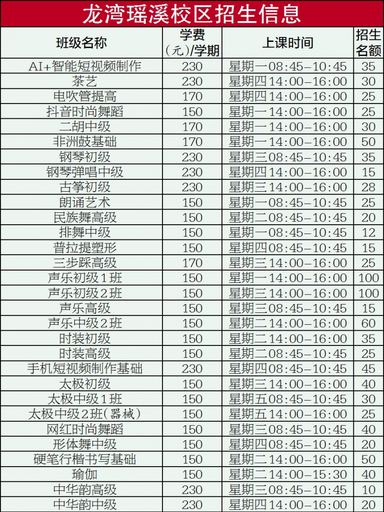 1.开学时间:2025年9月8日(周一)起正式开课,学员按照课程表到相应校区上课。
