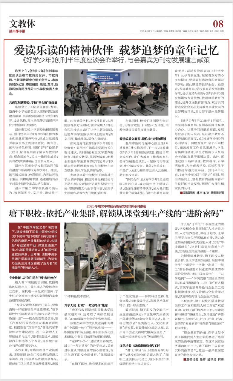 “协同合作,让《好学少年》走进校园、滋养心灵,成为温州学子爱读乐读、受益终身的精神伙伴,成为他们载梦追梦的童年记忆。”温州市教育局党委委员、副局长倪彤表示,《好学少年》 从孕育到诞生,凝聚着双方的心血与期待,要共同打造教育和新闻双向奔赴、彼此赋能的良好生态。她要求,各区教育局、学校要充分发挥刊物作用,提供支持与指导;《好学少年》则发挥媒体专业优势,传递尊重教育的理念,提升区域教育影响力,双方共同营造全社会关心支持教育事业发展的良好舆论环境,助力好学温州品牌建设。