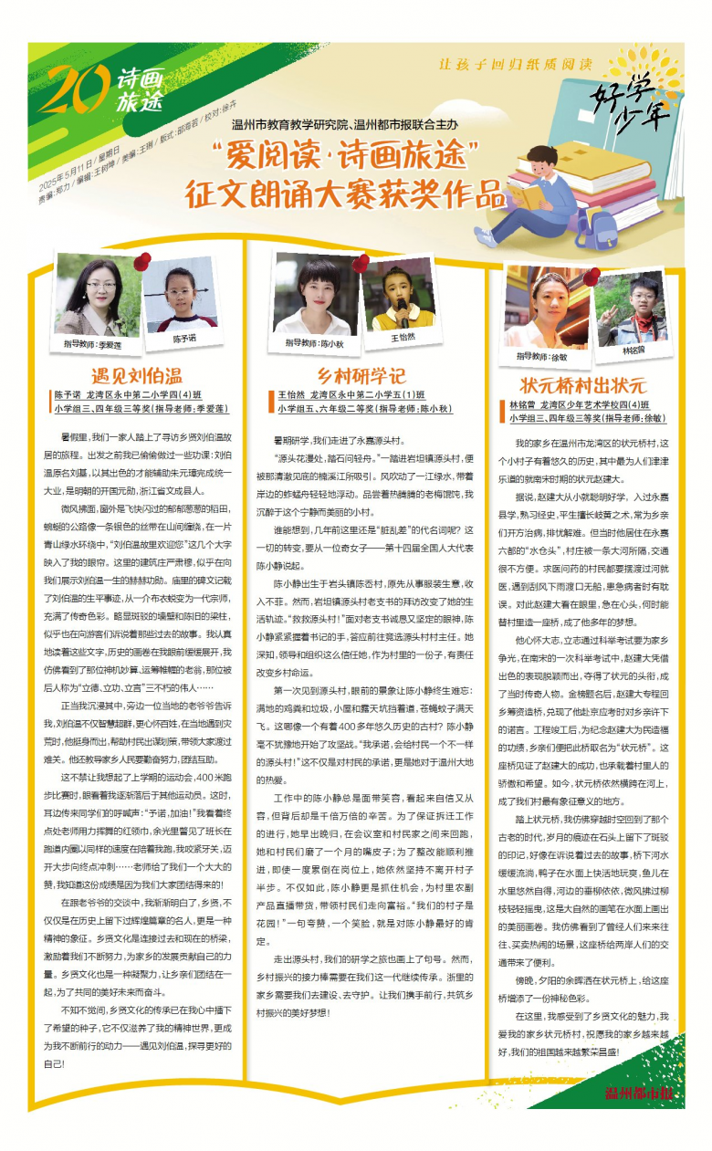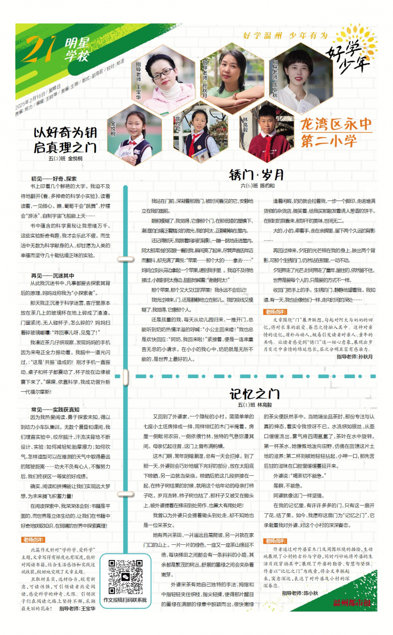 永中二小始终积极鼓励师生踊跃向《好学少年》投稿,是龙湾区最早在《好学少年》作文版上发表文章的学校。截至 6 月份,在王宝华、孙秋月、陈小秋、季爱莲等四位老师的精心指导下,王怡然、陈予诺、林高毅、陈约和、金悦桐等 5 名同学的佳作,先后登上 “明星学校”“诗画旅途” 等版面,在文学的舞台上熠熠生辉。