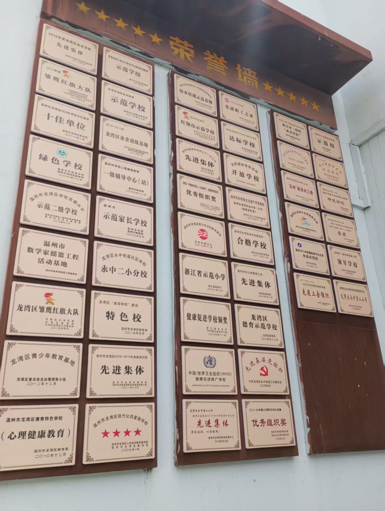 近年来,学校先后荣获全国 WHO 健康促进学校铜牌单位、全国青少年校园足球特色学校、浙江省示范学校、浙江省义务教育标准化学校、浙江省现代化学校、浙江首批中小学亲子辅导示范校、浙江省轮滑运动示范学校、浙江省阳光体育后备人才基地、温州市素质教育示范学校、温州市标准化学校、温州市义务水平一级学校、温州市体育大课间特色学校、温州市绿色学校、温州市红领巾示范学校、温州市规范型清廉学校、温州市价值观基地校、温州市非物质文化遗产传承基地校、龙湾区数学家摇篮工程领军学校等 100 多项荣誉称号。