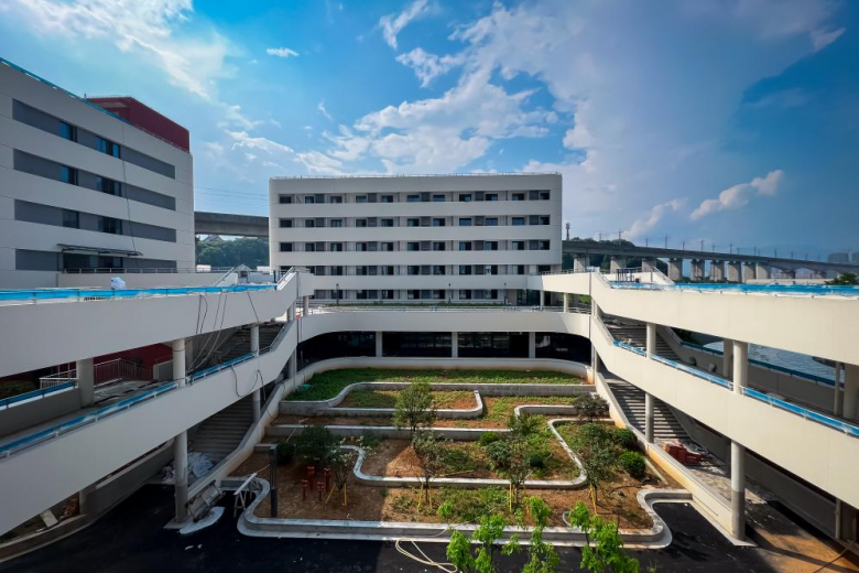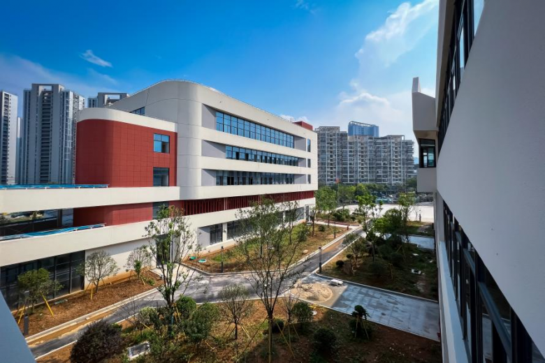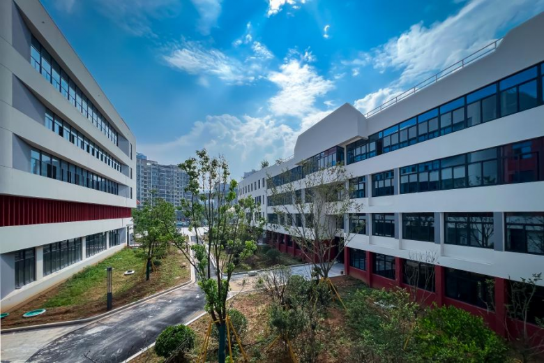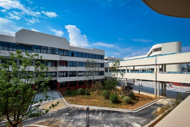 新校园以红白为主色调,营造出新新向荣、积极向上的氛围。崭新的楼宇错落有致,现代感十足的外观设计与周边环境相得益彰,这座承载着学校未来发展希望的新校园,已然成为区域内一道亮丽的风景线。