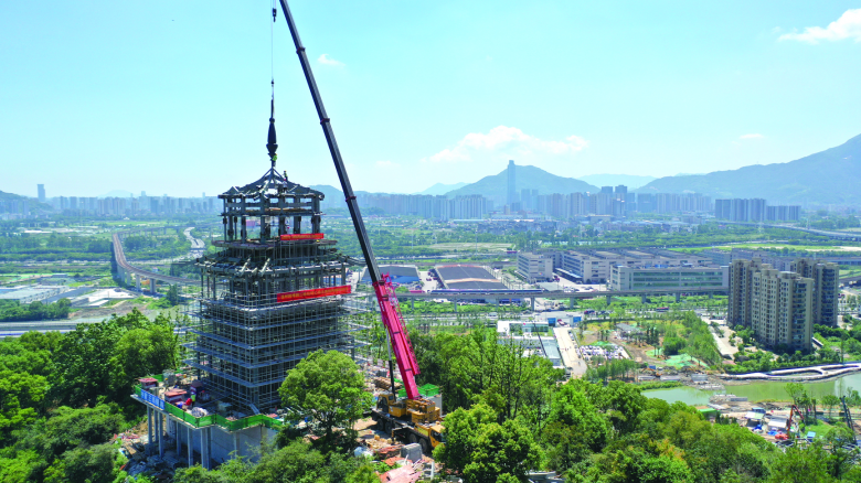 温都讯 7月31日,温州园博园北园仙门山顶,随着高7.1米的刹顶被吊机稳稳吊起,精准焊接于阁顶,郭公阁主体结构顺利封顶,比原计划足足提前了两个月。这也标志着郭公阁的建设工作将全面转入外立面与内部装饰施工的新阶段。