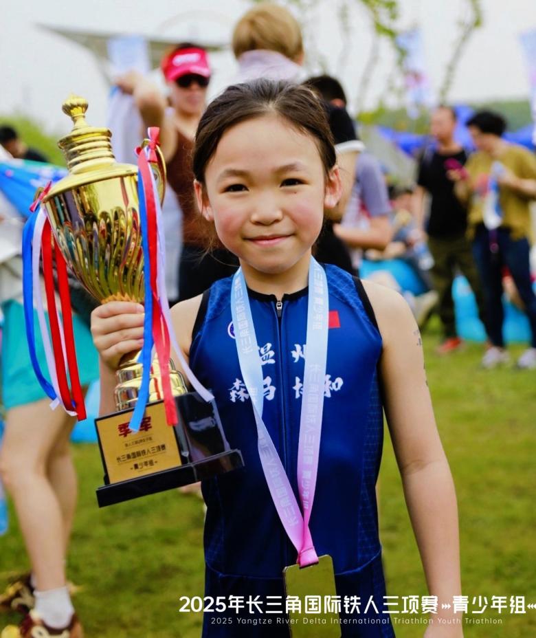 在日复一日的练习下,宝清在2025年中国小铁人系列赛暨城市家庭铁人三项赛青田站中,以16分12秒的成绩夺得女子U9迷你距离组(包括100米游泳、3200米自行车骑行、800米跑步)第一名。“虽然高温下训练时很累,但站上领奖台的那一刻,让我觉得一切都是值得的!”宝清笑着说。