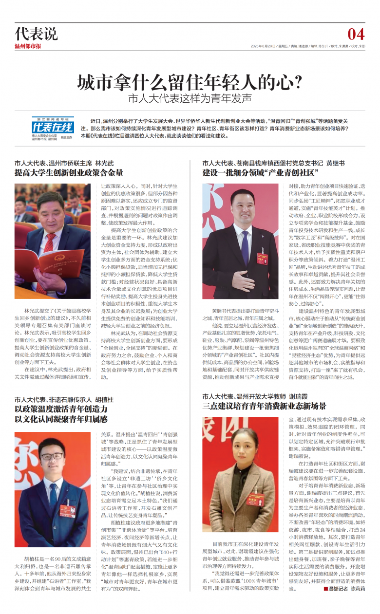 近日,温州分别举行了大学生发展大会、世界华侨华人新生代创新创业大会等活动,“温青回归”“青创强城”等话题备受关注。那么我市该如何持续深化青年发展型城市建设?青年社区、青年街区该怎样打造?青年消费新业态新场景该如何培养?本期《代表在线》栏目邀请四位人大代表,就此谈谈他们的看法和建议。