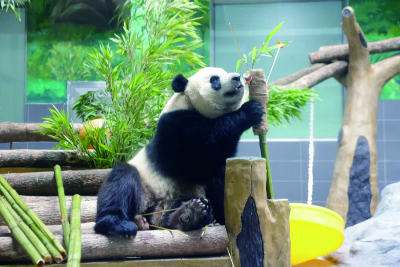 “宝弟”“宝妹”今年6岁,相当于人类的18岁,生长发育成熟,食量不小,喜欢吃竹子、竹笋、窝窝头等,在温州的饮食都是定制款。每天早上7时多,它们就晃头晃脑地“起床”了,饲养员一早就在馆内清理,铺上当天新鲜竹子,每天饲喂五至六次。