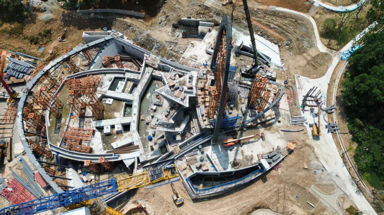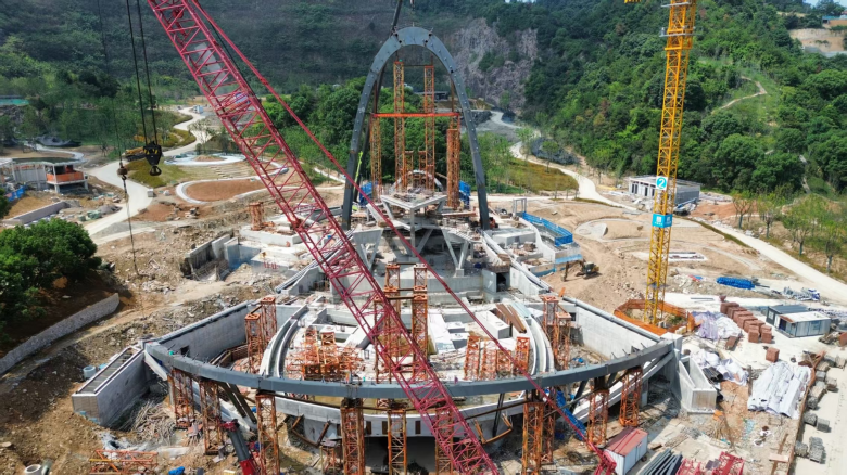 巨型双曲主拱、主入口巨拱、次入口巨拱的三大核心拱结构,正是支持这一设计理念的关键。在单体建筑中使用如此规模的拱结构,在全国来说尚属罕见。尤其是巨型双曲主拱,作为支撑整个建筑的最核心部分,为展现下窄上宽、下收上放的独特双曲几何形态和视觉效果,拱顶高度超40米、底部跨径达30米并在整体上呈3度的倾斜且单段最大重量超20吨,这些都对吊装精度、焊接质量等方面提出了极为严格的要求,施工难度在国内同类工程中属罕见水平。面对复杂结构形态与精度控制挑战,建设团队组织吊装方案专家论证会,全面优化施工流程。在实际吊装过程中,团队借助BIM(建筑信息模型)管理方法对建筑进行数字建模,根据建模结果对施工图纸进行深化,通过预埋段与地脚螺栓实现拱体与混凝土基础的精准对接,全程进行实时测量监控严格控制误差,最终一次性实现主体结构高精度闭合。