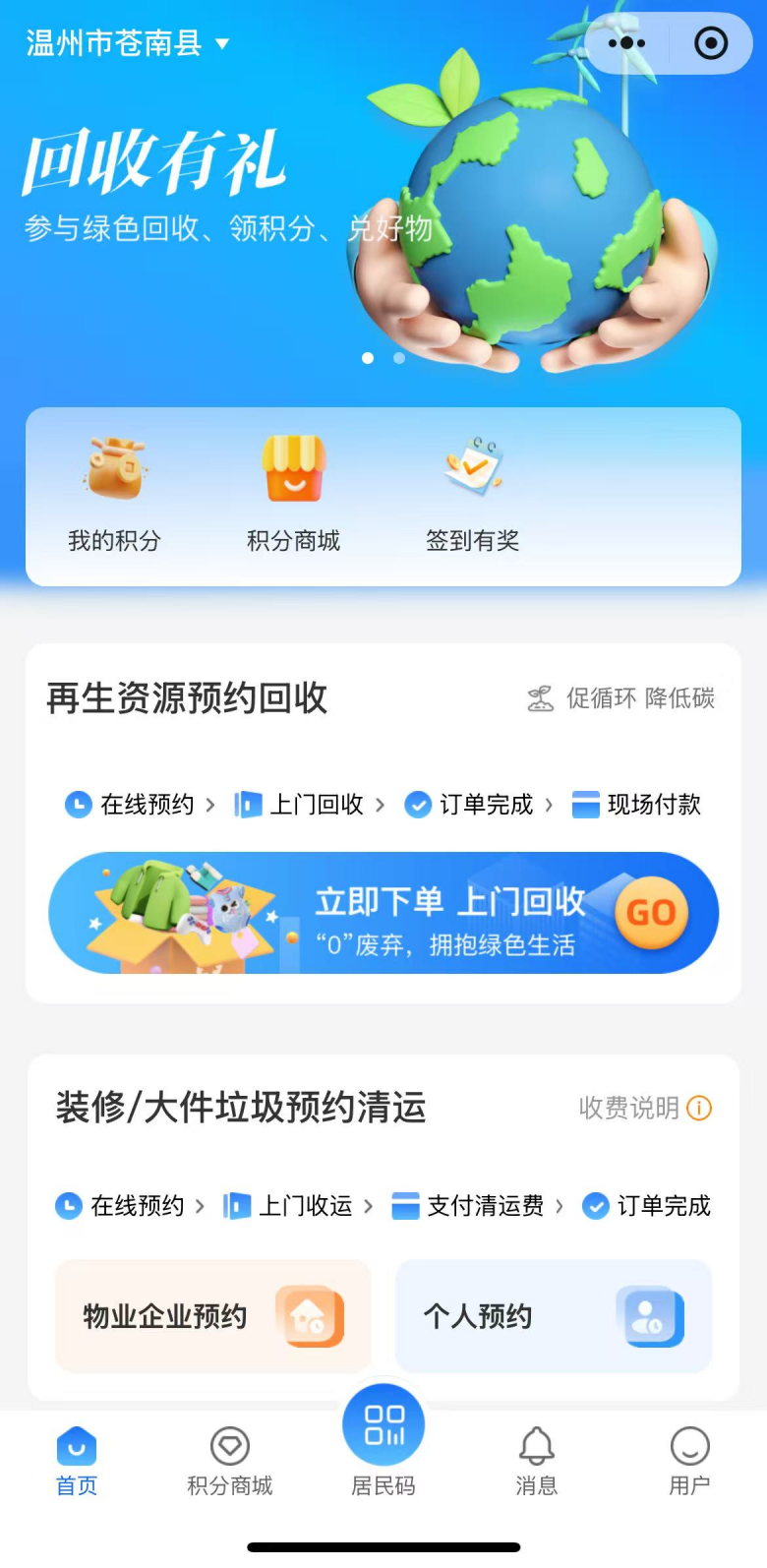 “苍南无废城乡”小程序由苍南县综合行政执法局和苍南县城投集团联合第三方相关科技企业开发,该程序平台可提供线上一键预约下单服务,涵盖日常可回收物、装修装潢垃圾、大件垃圾等物品回收功能,建立专业垃圾清运网络,通过线上线下融合模式推动“无废城乡”建设。目前,该平台已在县城灵溪镇全面试点推广。