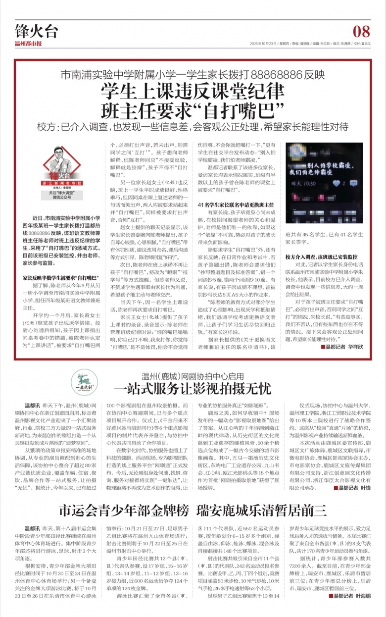 近日,市南浦实验中学附属小学四年级某班一学生家长拨打温都热线88868886反映,该班语文教师兼班主任陈老师对班上违反纪律的学生,采用了“自打嘴巴”的惩戒方式。目前该班级已安装监控,并由老师、家长参与监督。
