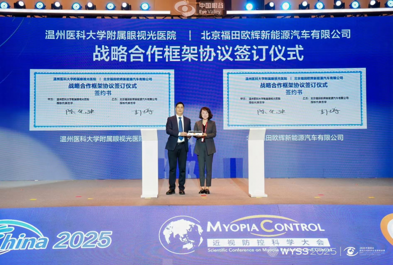 温都讯 近日,在“2025中国近视防控科学大会”开幕式上,温州医科大学附属眼视光医院和北京福田欧辉新能源汽车有限公司签订战略合作框架协议。双方将积极响应“健康中国”战略,聚焦“提升全民眼健康水平”核心目标,依托温医大附属眼视光医院的学科平台,结合北京福田欧辉新能源汽车有限公司的产业经验,开展眼视光功能诊疗车联合研发、党建共建、人才培养和慈善公益等一体化战略合作,为眼健康事业发展注入新动能。