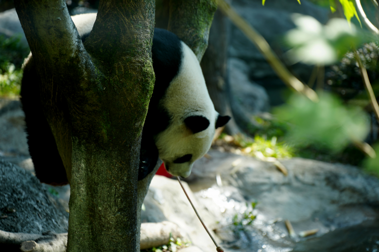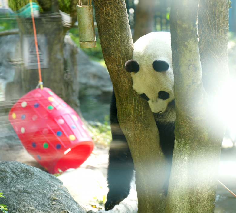 外场里的“双宝”展现出截然不同的性格特质:“宝妹”适应得很快,优哉游哉地在爬架与树干之间穿梭探索,若隐若现地像是在和游客“躲猫猫”,尽显对新环境的适应与喜爱;憨厚的“宝弟”则延续稳健节奏,喜欢躲在角落里,借用树干挡住身体吃竹子,等适应了之后还会做出领地标记的本能举动。