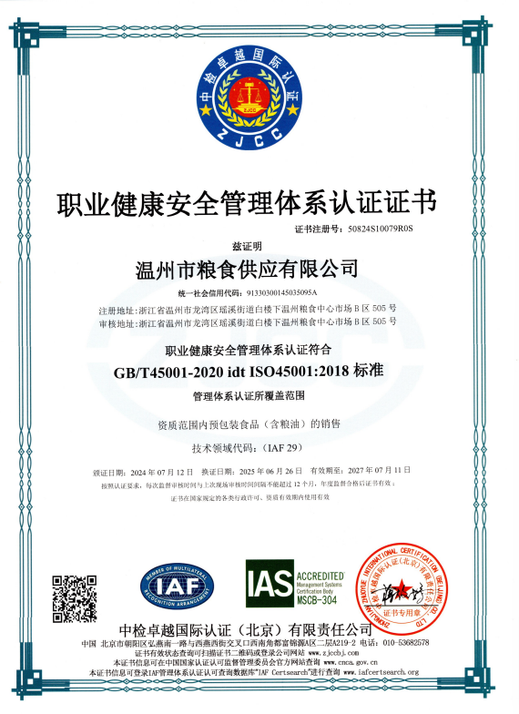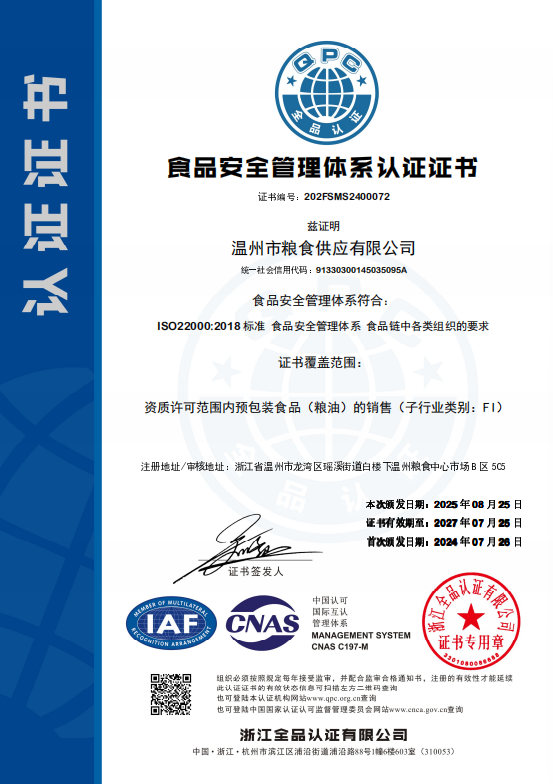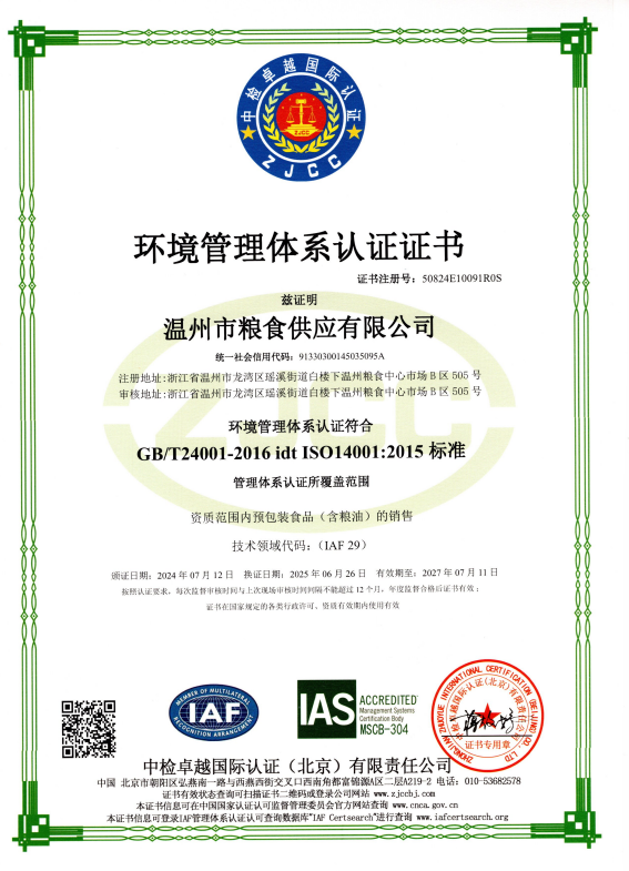 公司于2024年7月成功取得四类体系认证证书(质量管理体系、环境管理体系、职业健康安全管理体系、食品安全管理体系),为招投标业务及评选放心粮油示范企业奠定基础。