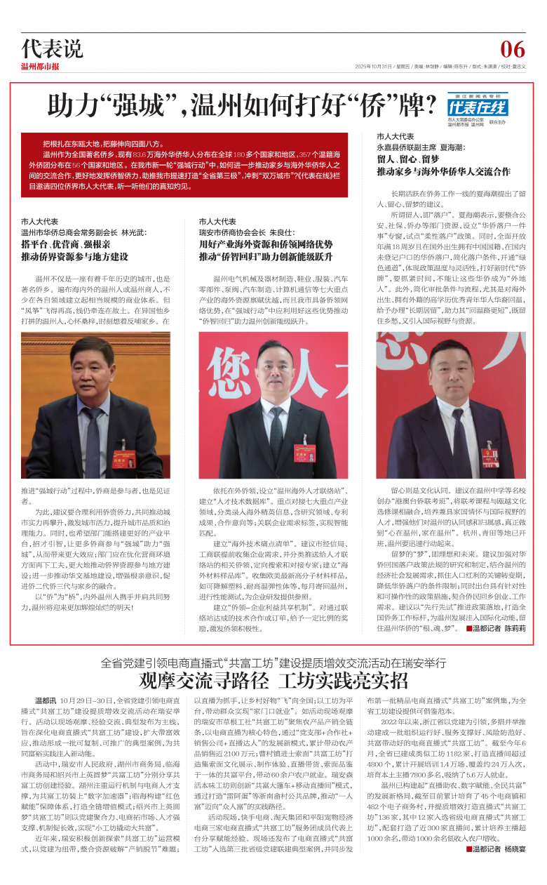温州作为全国著名侨乡,现有83.6万海外华侨华人分布在全球180多个国家和地区,357个温籍海外侨团分布在56个国家和地区。在我市新一轮“强城行动”中,如何进一步推动家乡与海外华侨华人之间的交流合作,更好地发挥侨智侨力,助推我市提速打造“全省第三极”,冲刺“双万城市”?《代表在线》栏目邀请四位侨界市人大代表,听一听他们的真知灼见。