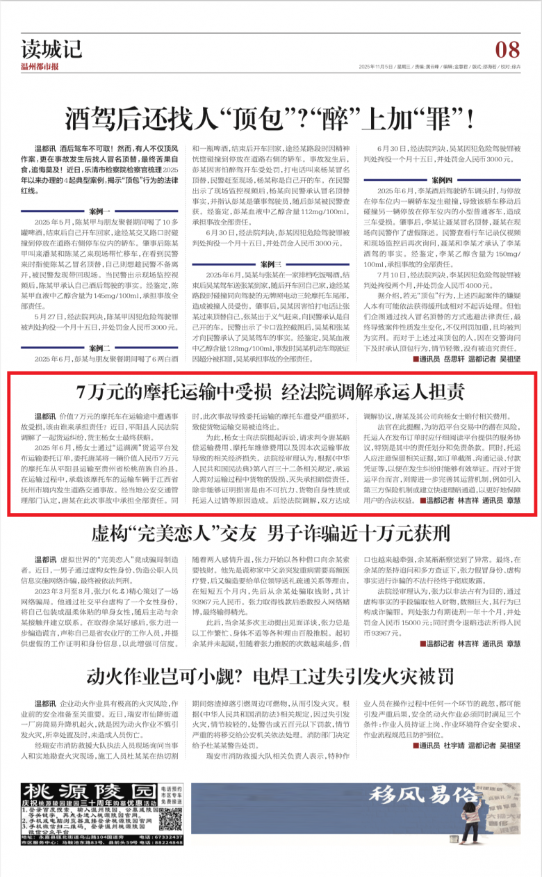 温都讯 价值7万元的摩托车在运输途中遭遇事故受损,该由谁来承担责任?近日,平阳县人民法院调解了一起货运纠纷,货主杨女士最终获赔。