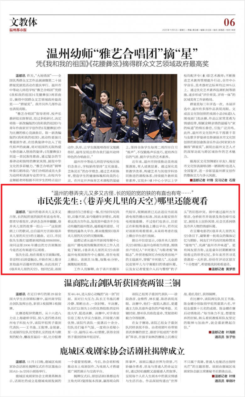 温都讯 “温州的巷弄夹儿又多又古怪,长的短的宽的狭的有直也有弯,想老早看现在,讲讲念念拌拌翻翻,巷弄夹儿里的故事一担山……”这段朗朗上口的歌词,出自温州方言剧《巷弄夹儿里的天空》的主题曲。近日,市民张先生拨打温都新闻热线88868886,询问这部2006年播出的方言剧集如今是否还有渠道可以观看。