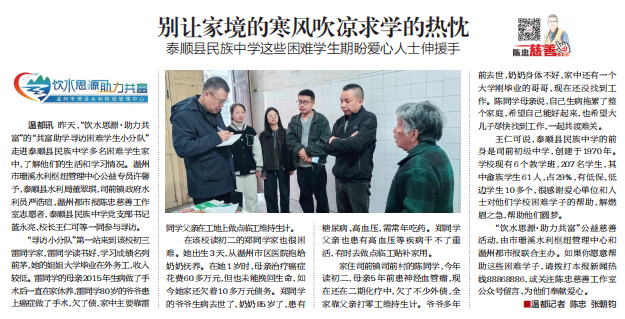“饮水思源·助力共富”公益慈善活动,由市珊溪水利枢纽管理中心和温州都市报联合主办。如果你愿意帮助这些困难学子,请拨打本报新闻热线88868886,或关注陈忠慈善工作室公众号留言,为他们奉献爱心。