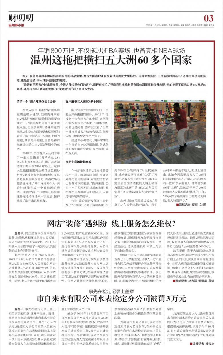 “昨天有巴西客户过来看样品,今天这几位是也门的客户,最近有点忙。”苍南县胜丰棉制品有限公司董事长陶开宋说,他的拖把不仅拖过浙BA赛场的场地,还拖过NBA赛场的地板,如今更是“拖”到了全球五大洲。