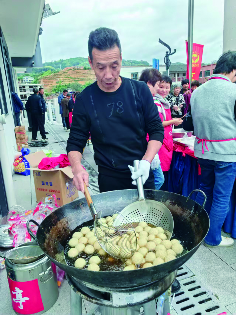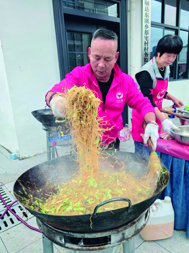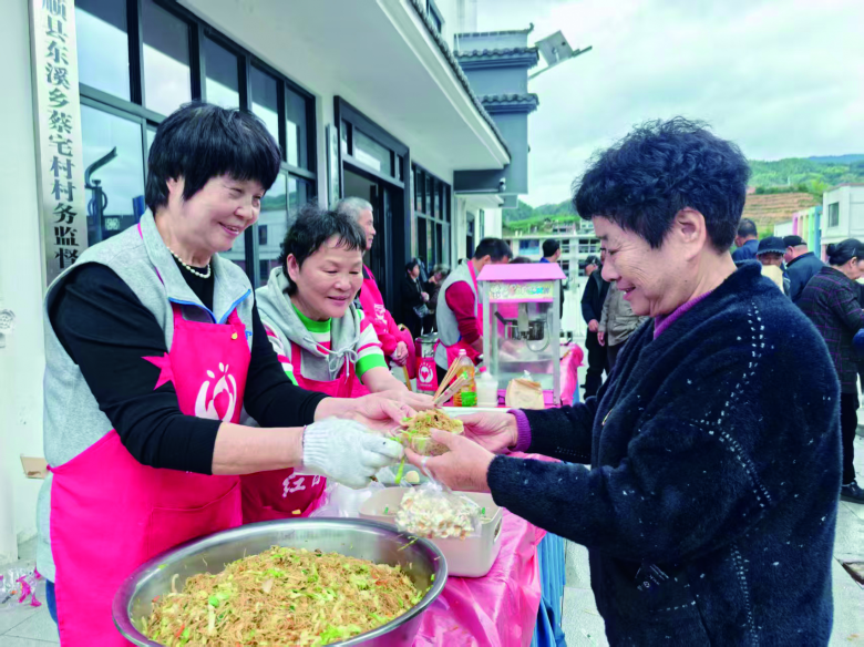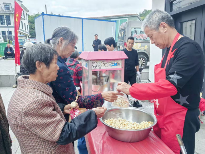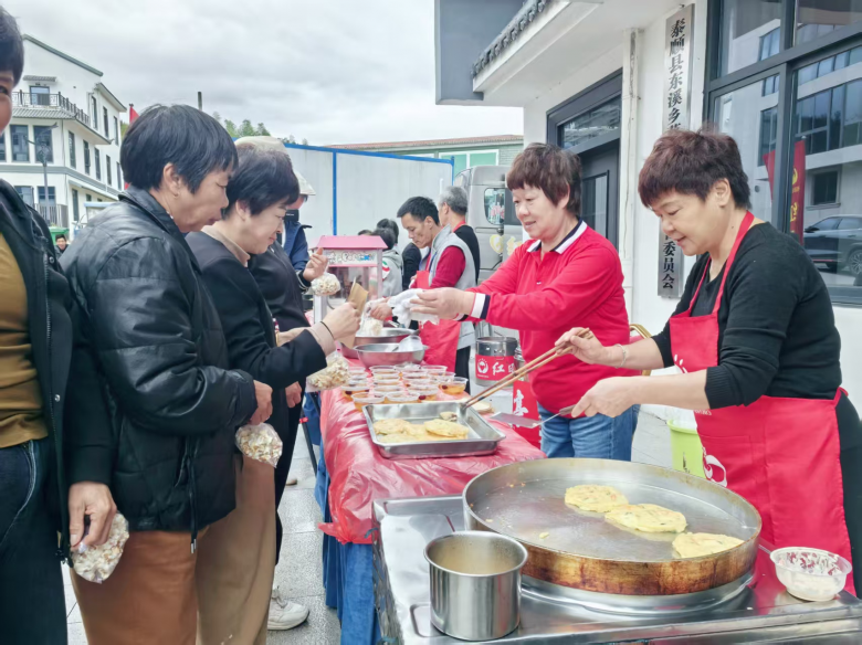 很快,炒粉干、鸡蛋葱油饼、芝麻球、爆米花、桂圆红枣汤等一道道温州小吃的香气弥漫开来,吸引了众多村民。大家围拢过来,品尝着来自市区的美味,脸上洋溢着幸福的笑容。