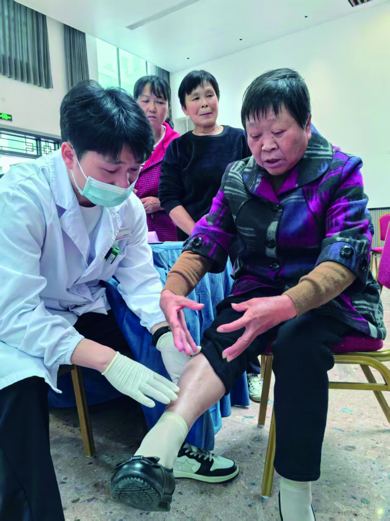 爱心不止于集中义诊。当医护人员得知村口75岁的蔡阿公因病长期卧床、行动不便后,立即主动上门服务。蔡阿公4年前不幸患病,手脚无力、身体抖动,生活无法自理。经过初步检查,医生判断其可能为中枢神经受损,并现场指导家属如何进行康复训练,同时特别提醒注意预防和护理阿公臀部的压疮溃烂。