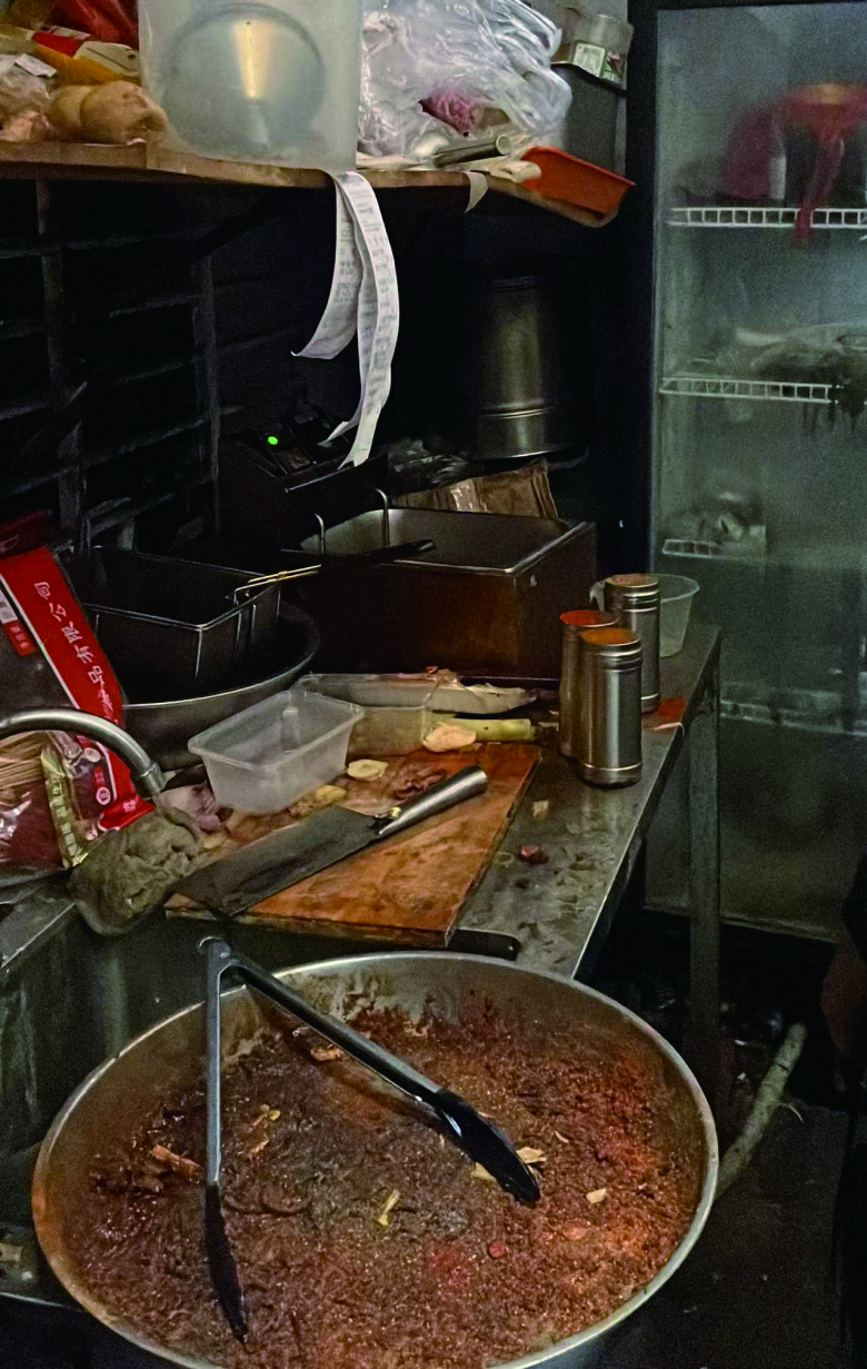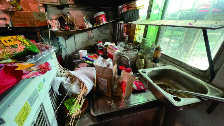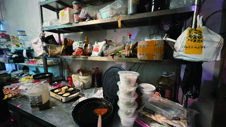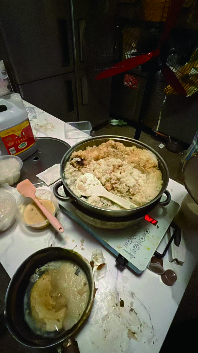 进入第一个小房间,中间岛台上正在加热一锅米饭,掀开锅盖,一股馊味随即飘出;一旁放着几碗已盛入快餐盒的米饭,还有一碗不明的液体、开盖的调味料,以及一口沾满油渍的小奶锅,整个台面凌乱不堪;一个沾满油污灰尘的电饭锅,敞着盖放在地上;靠墙的桌上也堆积着杂物,一次性碗筷和调味料等物品未加遮盖,随意摆放。