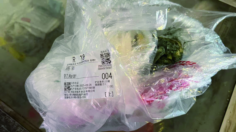 记者随同市监执法人员进入该店,刺鼻的异味更加浓烈。入门处的大厅摆放着三台冰柜,执法人员打开柜门,随手取出一包食材,只见袋子里的河粉表面已布满绿色霉斑,包装上标注生产日期为2025年9月26日,保质期三日。冷藏柜里还存放着一个腐烂的西瓜,底部渗出浑浊汁液。墙角处一塑料盒中盛着胶冻状不明食物,一只小狗在周围来回走动。“这是什么东西?”记者问。商家说:“这些食物是用来喂狗的。”