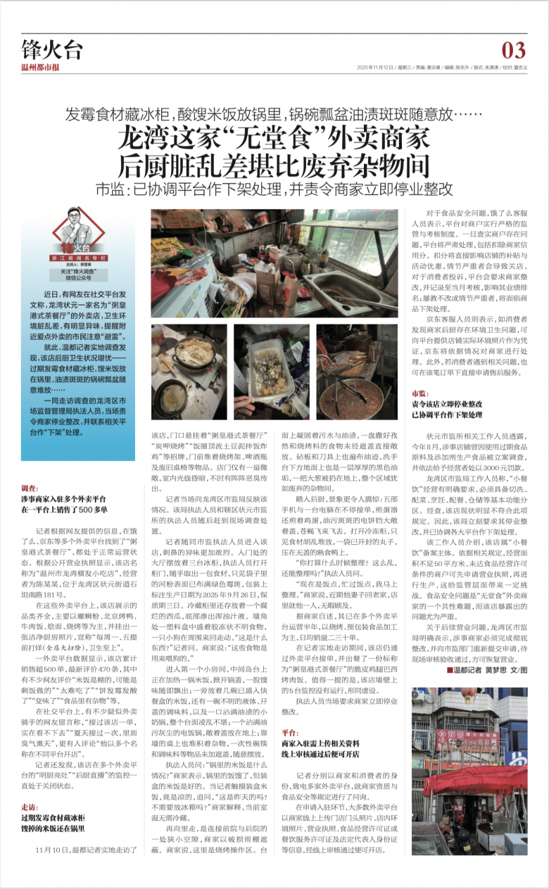 一同走访调查的龙湾区市场监督管理局执法人员,当场责令商家停业整改,并联系相关平台作“下架”处理。