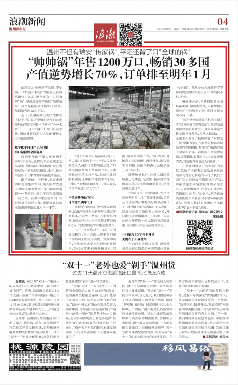 使用近30年仍然不生锈、不粘锅,一口“温州制造”的锅最近在网络爆红。其实,温州还有一口厉害的“锅”,早已是海外市场的“隐形冠军”,其产品畅销全球超30个国家,年销量突破1200万口。