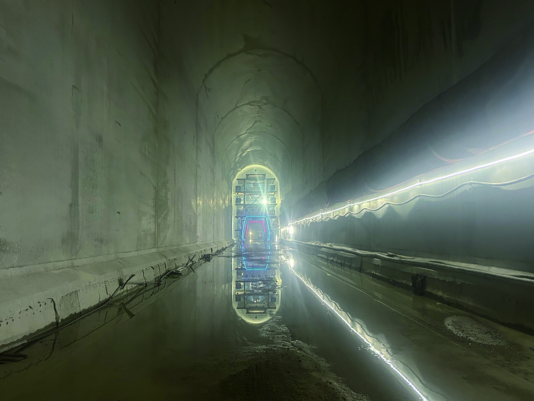 全线贯通后,建设者马不停蹄转入衬砌施工,实行24小时连续作业,投入多套先进钢模台车系统,严格把控质量与安全,顺利完成所有主洞衬砌任务。其中,一标段渡垟隧洞衬后断面最大处达10.1米高、26.32米宽,规模宏大,被称为“洞内水库”。
