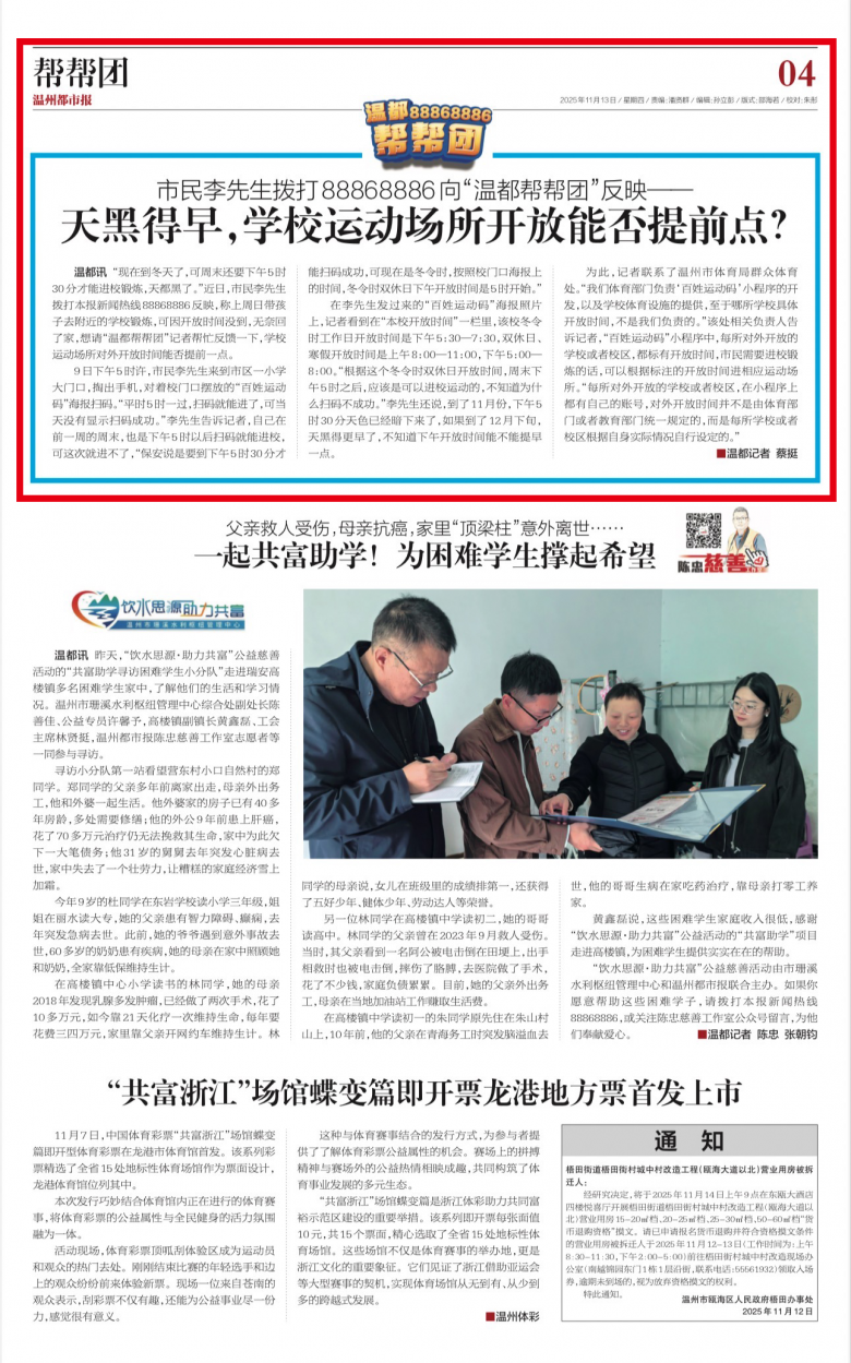 温都讯 “现在到冬天了,可周末还要下午5时30分才能进校锻炼,天都黑了。”近日,市民李先生拨打本报新闻热线88868886反映,称上周日带孩子去附近的学校锻炼,可因开放时间没到,无奈回了家,想请“温都帮帮团”记者帮忙反馈一下,学校运动场所对外开放时间能否提前一点。
