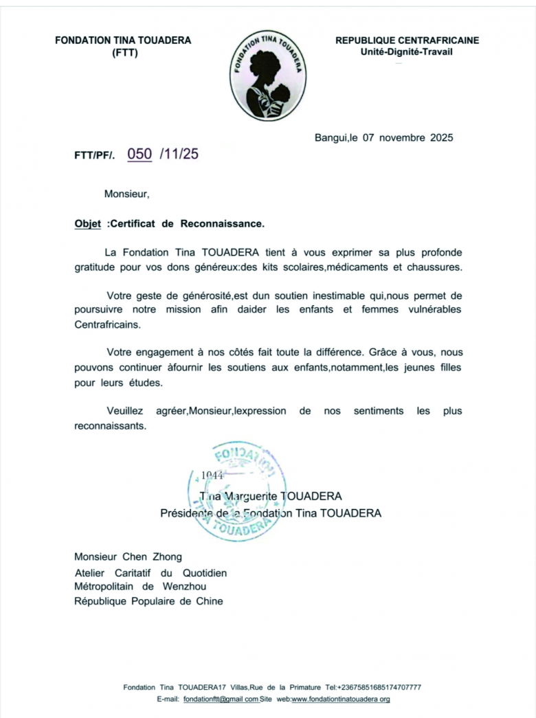 温都讯 近日,中非共和国总统夫人蒂娜·图瓦德拉向温州都市报陈忠慈善工作室、瓯海区慈善总会、瓯海区人民教育基金会、温州曙光中西医创面修复医院院长陈善亮、温州市慈善总会秘书长李武、温州医科大学附属第一医院医务部主任暨玲等发来感谢信,感谢以上单位和个人慷慨捐赠了100多万元文具、鞋子、药品等爱心物资,帮助了中非共和国的弱势儿童和妇女。