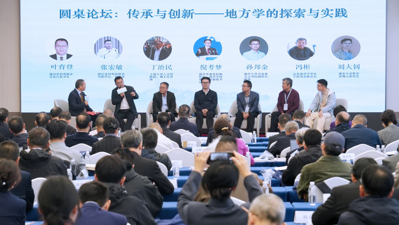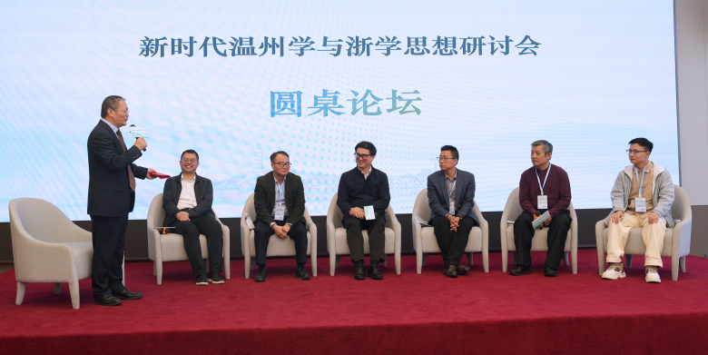 温州学研究联合会执行秘书长叶育登主持了以“传承与创新——地方学的探索与实践”为主题的圆桌论坛。浙江省社科院哲学所副所长张宏敏、上海大学文学院教授丁治民、温州市委党校副校长倪考梦、温州大学马克思主义学院副院长孙邦金、山东省济宁市孔子研究会副会长冯彬、清华大学哲学系博士研究生刘大钊六位嘉宾,围绕新时代温州学与浙学思想的传承、创新与发展展开了热烈而深入的对话。
