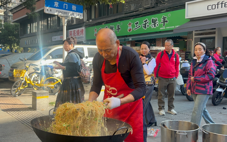 11月16日上午,红日亭义工志愿者沙定友、余建国、黄加松、陈兴社、汪少华、陈小眉、周跃南、黄伟君,便来到十八家赛区,架起炉灶,现场制作热气腾腾的炒粉干与葱油鸡蛋饼。香气四溢的美食不仅暖了观众的胃,更暖了大家的心。