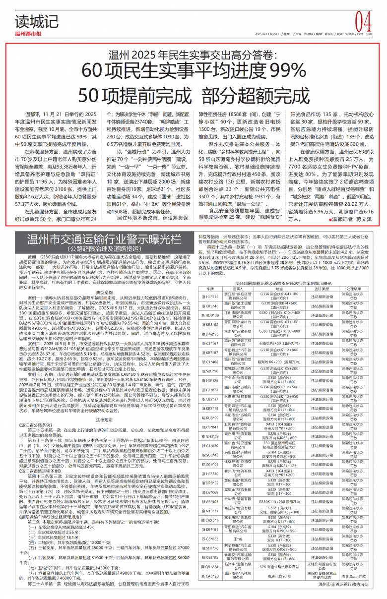 温都讯 11月21日举行的2025年度温州市民生实事实施情况新闻发布会透露,截至10月底,全市十方面共60项民生实事平均进度已达99%,其中50项实事已提前完成年度目标。